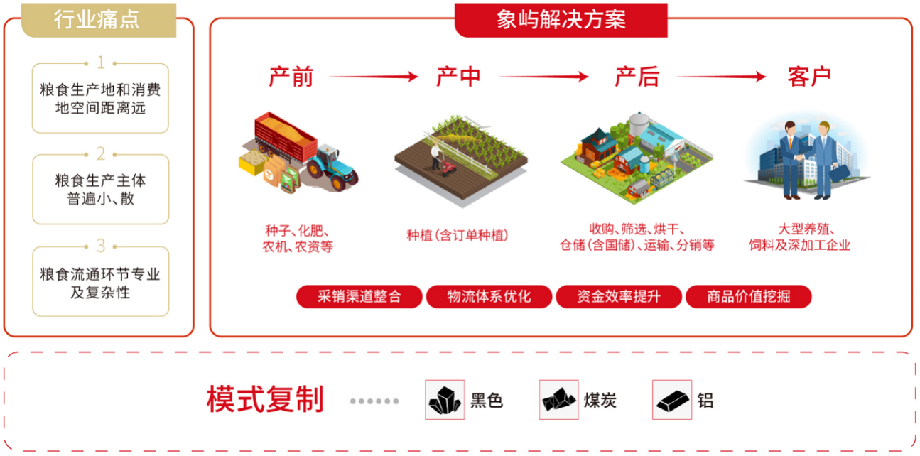 今年初,象嶼聯(lián)手阿里云結合東北農(nóng)業(yè)實際,攜手在糧食板塊先行先試建設農(nóng)業(yè)產(chǎn)業(yè)級互聯(lián)網(wǎng)平臺。該平臺將貫穿糧食產(chǎn)業(yè)鏈種植、倉儲、流通三大環(huán)節(jié),借助物聯(lián)網(wǎng)、云計算、區(qū)塊鏈手段實現(xiàn)輕資產(chǎn)模式下倉容快速擴張,連接用糧方、金融、物流等生態(tài)方,提升全產(chǎn)業(yè)鏈貿(mào)易、物流與金融效率。 未來,象嶼農(nóng)產(chǎn)將做深“一條鏈”,做大“一個園”,形成共創(chuàng)共享共贏的全產(chǎn)業(yè)鏈資源生態(tài)系統(tǒng),圍繞“雙循環(huán)”發(fā)展格局,進一步優(yōu)化投資結構,延伸投資鏈條,創(chuàng)新產(chǎn)業(yè)模式,為鄉(xiāng)村振興、促進農(nóng)業(yè)高質高效發(fā)展貢獻力量!