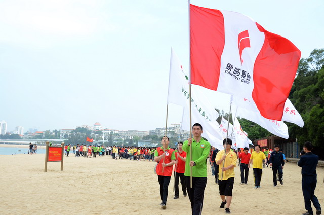 活動啟動儀式上,集團公司黨委副書記、工會主席陳偉彬代表集團領導班子向共建單位代表及全體員工致以節(jié)日的問候!陳副書記表示,我們要尊重勞動、謳歌勞動者;我們要倡導運動,褒獎優(yōu)勝者;我們崇尚遠大的理想,憧憬美好的未來。海軍南方局李躍峰副政委對象嶼集團在勇?lián)鐣熑?、傳承愛心善行方面所作的努力高度贊揚,并表示這對深入培育當代革命軍人核心價值觀方面具有十分積極的推動促進作用。隨后進行了“象嶼集團縱走俱樂部”授旗儀式,集團總裁張水利為縱走俱樂部授旗,號召更多縱走愛好者“走在一起,樂在一起”!集團及海軍南方局領導、十佳員工及志愿者代表鳴槍發(fā)令,全體人員在司旗的帶領下,向著音樂廣場出發(fā)了!