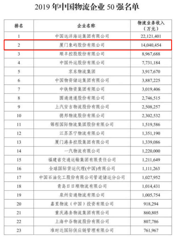 今日,中國(guó)物流與采購(gòu)聯(lián)合會(huì)公布了2019年度中國(guó)物流企業(yè)50強(qiáng)排名,象嶼股份蟬聯(lián)第2。